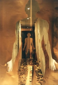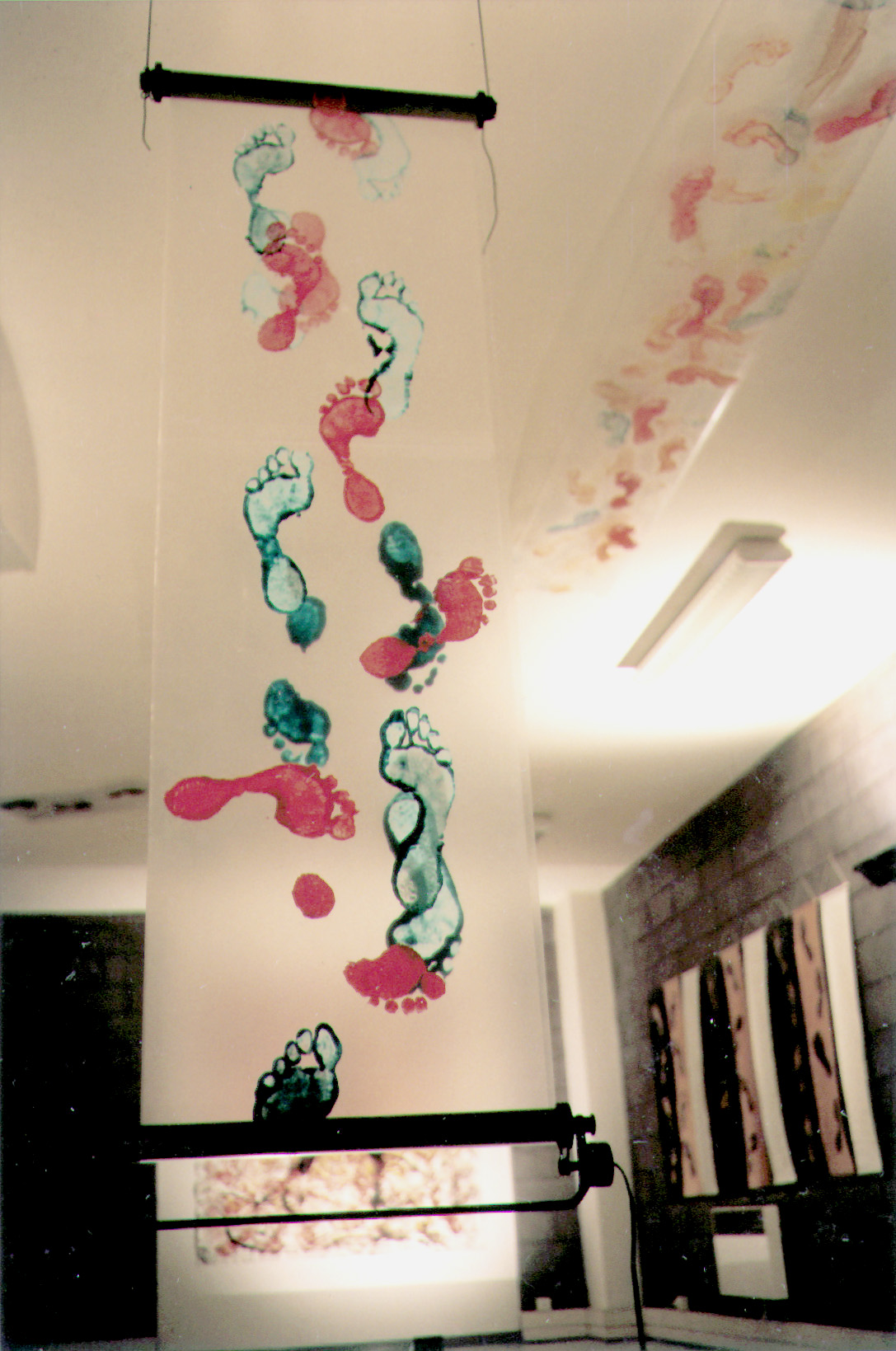 "Avec les années 90, l’œuvre de Bernard Gast est traversée par l'obsession de l'empreinte : appréhender la réalité, la fixer ou plutôt la capturer par des moyens plastiques. Ainsi, par de multiples procédés sommes-nous invités à suivre les empreintes, à nous intégrer à leur émergence : "Le couloir de Sensations (1995) (Image 5 ci-dessous) ; La chair translucide de ses radiographies ou empreintes de l'intérieur (1994) ; traces de pas dans le sable ou empreintes éphémères de "L'Hermite" (1994) ; sa performance "Je est aussi l'Autre" (1996) superposant visages photographiés sur visages réels comme empreinte virtuelle d'autrui ; "Les grands transparents" (1998), empreintes de paysages comme défi à l'idée même d'empreinte ; La dynamique installation de "La machine à pas" (1994) (Image 6 ci-dessous), mue par un moteur et suspendue... Qui semble contrebalancer l'invention de ses "Peintures avec le Cinéma" qu'il réalise avec des bandes-annonces de films cinématographiques comme des empreintes mouvantes devenues fragments figés de mouvement... Pour devenir Peintures".