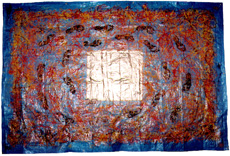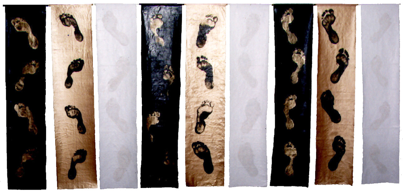 L'artiste italien Giuseppe Penone - l'une des figures majeures de l'Arte Povera - travaille également... 'Accompagné !' En 1990, je travaille avec l'une de ses assistantes qui m'explique sa participation et comment il associe le corps à la nature. Dans sa magnifique oeuvre, Verde del Bosco, (Image 11 ci-après) Giuseppe Penone frotte le végétal pour dessiner sur la toile où se distingue une silhouette entre les arbres. Comme Penone, j'aime 'fixer' un instant de présence (de la nature, de mon propre corps et du corps de l’autre). A la même période, j’imprime des pas à l’extérieur avec des actions sur le bitume parisien et ailleurs (Image 7 ci-dessous). Comme sur La Ronde de nuit (Image 8 ci-dessous), des empreintes de pieds partent d’un carré d'or et décrivent une spirale de pas se dirigeant vers l’extérieur.