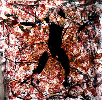 Je crée l'empreinte du corps d'un ami (Image 10 ci-dessous), dans une oeuvre 'participative' qui rend hommage aux anthropomorphies de Yves Klein et aux 'Dripping' de Jackson Pollock (Image 9 ci-dessous).